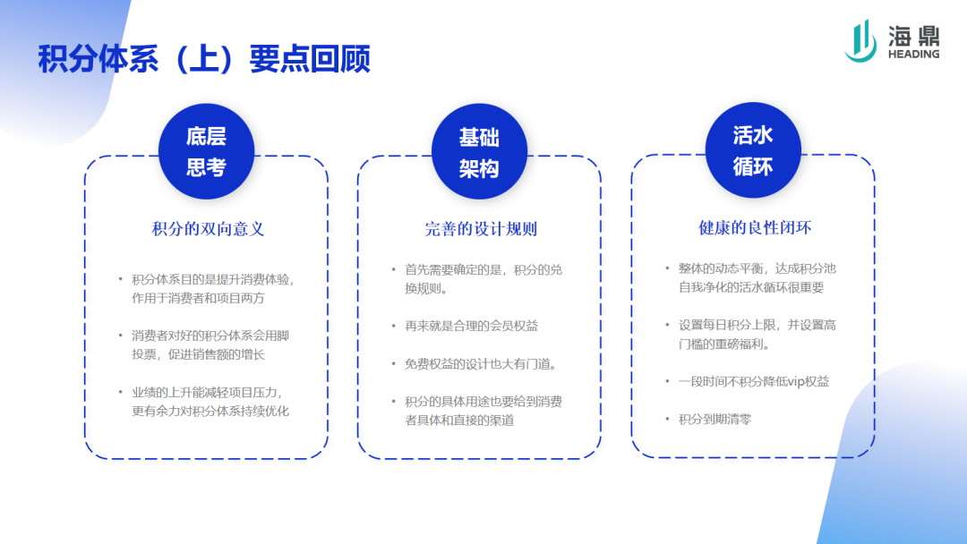 同時,海鼎科技也可以遵循已經(jīng)形成閉環(huán)的邏輯和理論,利用已有的會員營銷類產(chǎn)品,協(xié)助企業(yè)和項目進(jìn)行積分體系的搭建、實施和具體實踐,使積分體系的打造更上一層樓。
